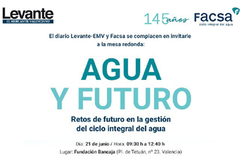 Con el objetivo de dar a conocer los principales retos de futuro que deberá afrontar la gestión del ciclo integral del agua, FACSA y el periódico Levante-EMV celebrarán mañana jueves, 21 de junio, el I Foro Agua y Futuro. Una mesa redonda que reunirá a algunos de los principales expertos en medio ambiente, cambio climático y el ciclo integral del agua con el fin de debatir acerca de las principales problemáticas, retos y amenazas a los que se enfrenta el sector, así como sus posibles soluciones.