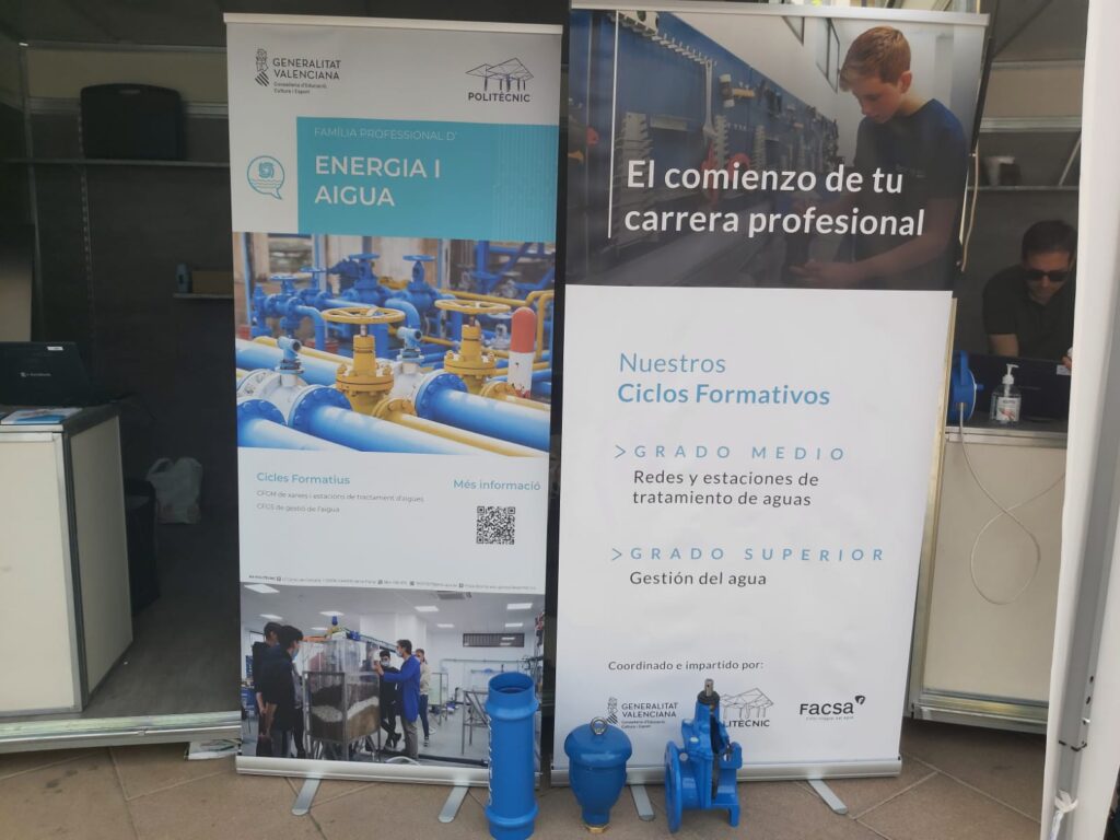 En la caseta expositiva dedicada a la familia de titulaciones relacionadas con el sector Energía y Agua, Laura Gabín, responsable del departamento de Formación y Desarrollo de Facsa, ha dado a conocer los dos grados – el grado medio y superior- que desde la empresa se imparten en colaboración con Consellería de Educación y el IES Politècnic. Por otro lado, la compañía ha impartido un taller sobre unión de tuberías, uno de los contenidos que se abordan en estos estudios.