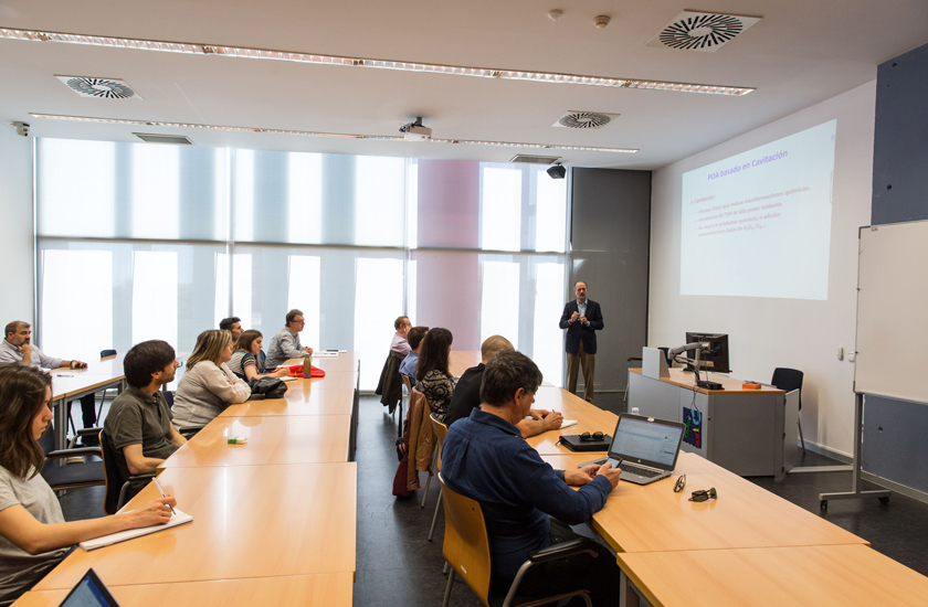 Durante el evento, se han señalado algunas de las posibilidades que ofrece la cavitación. Un proceso por el que el agua pasa directamente a fase gas por una bajada brusca de la presión, sin tener que aportar calor. En base a este proceso, César Dopazo y Luis Cerecedo han presentado varias aplicaciones de procesos de cavitación que el Área de Mecánica de Fluidos de la Universidad de Zaragoza ha empleado en proyectos desarrollados a lo largo de dos décadas y que permiten reducir la concentración de sustancias contaminantes en el agua sin la necesidad de adicionar productos químicos. Tal y como han apuntado los ponentes, “cuando las burbujas de vapor que se generan implosionan de forma brusca en el agua, lo hacen de una forma tan violenta que la presión y temperatura aumenta enormemente de forma puntual, y es ahí donde radica su poder de degradación de contaminantes del fluido o de sus componentes”.